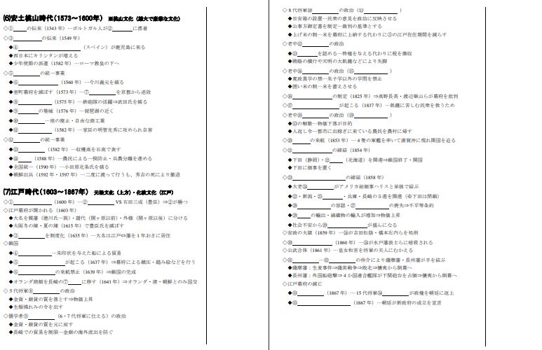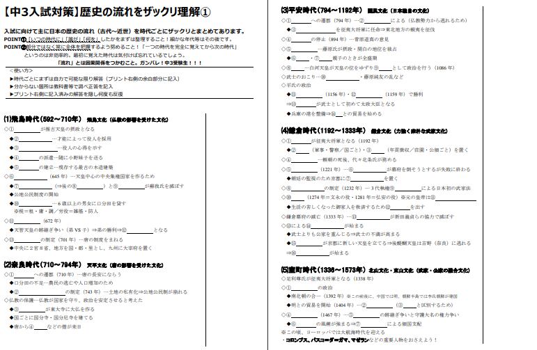高校入試向けて歴史の基礎知識を身に付けるためのプリントです。年表の穴埋めをしながら飛鳥時代~江戸時代までのおおまかな復習ができます。